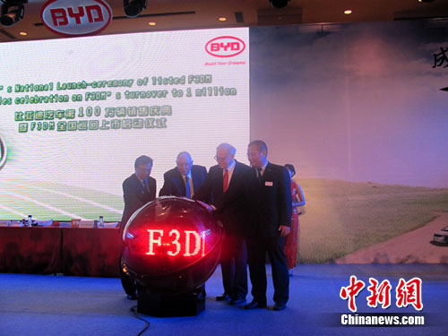 中新社深圳9月27日電(記者 鄭小紅)27日下午,隨著股神巴菲特親手將一輛F3DM鑰匙交付給比亞迪車主,比亞迪汽車迎來了銷售突破100萬輛的歷史時(shí)刻。