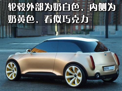 MINI Core概念車采用內(nèi)凹陷七幅白色輪轂,內(nèi)側(cè)噴涂的是奶黃色,造型非常可愛就如由巧克力制成一樣。