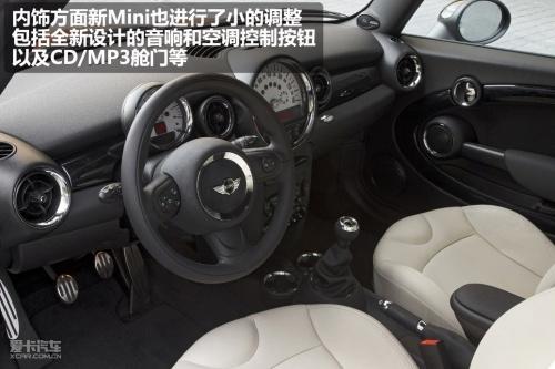 內(nèi)飾方面新MINI也進(jìn)行了小的調(diào)整,其中包括全新設(shè)計的音響和空調(diào)系統(tǒng)控制按鈕、以及CD/MP3艙門等。配置方面將增加升級版收音機(jī)、MP3/CD播放器、AUX接口微型導(dǎo)航儀、彩色行車電腦顯示器、藍(lán)牙和USB音頻接口等。