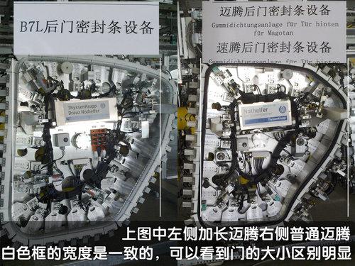 在一汽大眾位于長(zhǎng)春的二廠(chǎng)生產(chǎn)線(xiàn)上記者也確實(shí)看到了寫(xiě)有“B7L”字樣的車(chē)門(mén)試裝區(qū)域。從車(chē)門(mén)的“夾具”來(lái)看,普通的邁騰(B6)與加長(zhǎng)后的邁騰(B7L),在門(mén)的大小上有非常明顯的區(qū)別,并且我們從工作人員那里也獲得了B7L是加長(zhǎng)邁騰的肯定答案。