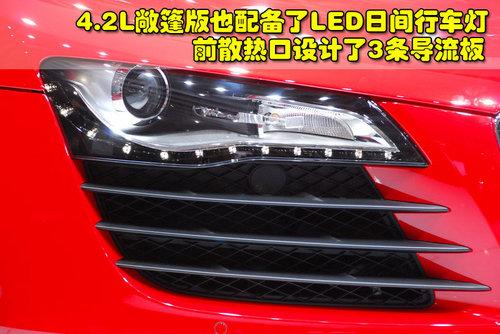 奧迪R8 4.2L敞篷版與5.2L車型一樣,都采用了輕量化軟頂設(shè)計(jì),當(dāng)頂棚全部敞開時(shí),讓原本激進(jìn)低俯的外觀更加拉風(fēng)。奧迪R8 4.2L敞篷版的頂篷采用電子液壓控制,在車輛時(shí)速50公里或以下時(shí)頂篷可以在19秒內(nèi)打開或收起。后車窗從頂部向兩邊分開,這可以讓頂篷完全獨(dú)立的打開。