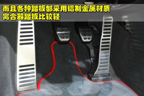 奧迪R8 4.2L敞篷版由于標(biāo)配的是六速手動(dòng)變速箱,油門、剎車以及離合器踏板都是采用輕量化的鋁制金屬材質(zhì),而且還配備了左腳休息踏板,離合器踏板的力度比較輕,但看上去制動(dòng)踏板有些偏小,并沒(méi)有經(jīng)過(guò)特殊的設(shè)計(jì)。