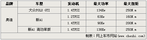 從表中可以看出,巴黎車展奧迪帶來的高功率版A1搭載的1.4TFSI擁有“缸內(nèi)直噴+機(jī)械曾也+渦輪增壓”三項(xiàng)技術(shù),經(jīng)過特殊調(diào)教,功率超過大眾POLO GTI有4Kw,達(dá)到138Kw,為小型車功率之冠;最大扭矩達(dá)到250N.m。百公里加速僅為6.9秒,是一款名副其實(shí)的勁量小鋼炮。