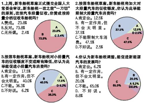 對(duì)于車船稅的這種調(diào)整方向,廣大消費(fèi)者是如何看待的呢?上周,本報(bào)聯(lián)合新浪汽車對(duì)此進(jìn)行了調(diào)查,結(jié)果顯示,多數(shù)讀者表示:贊成車船稅改變“一刀切”的簡(jiǎn)單征稅模式而進(jìn)行這種更趨向公平的改革,但認(rèn)為“不是按價(jià)格而是按排量劃分檔次征收,仍然顯得不太合理”。在調(diào)查中,有73.8%的消費(fèi)者持這個(gè)觀點(diǎn),另外還有2.4%的消費(fèi)者棄權(quán),只有23.8%的消費(fèi)者表示贊成。