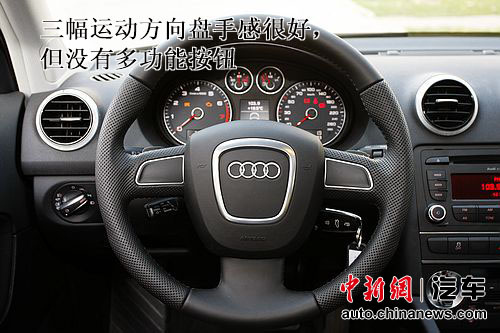 A3的方向盤手感著實(shí)不錯,兩側(cè)皮質(zhì)上的花紋大大增強(qiáng)了握感和防滑性,大小也相當(dāng)適中。只是讓我大惑不解的是,為什么在一輛售價30余萬,配備了自動空調(diào)、方向盤換擋撥片、電動座椅調(diào)節(jié),甚至自動泊車系統(tǒng)的車型上,竟然沒有裝備小小的多功能方向盤?