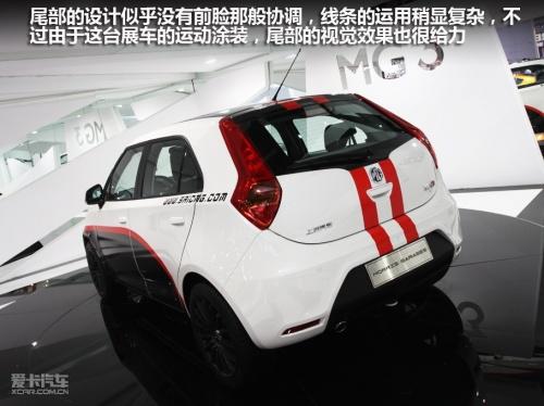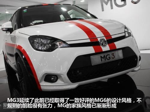 此次拍攝的這臺展車,經(jīng)過了廠家的輕度改裝。主要是“身披”了一套戰(zhàn)斗風(fēng)格非常濃烈的車身拉花,以及4個黑色的賽車競技風(fēng)格輪轂,其余部分與量產(chǎn)車型無異。外觀經(jīng)過精心改造的MG3愈顯有型,是一臺非;鹄钡倪\(yùn)動型A0級小車。從前臉可以看出,MG3與MG6風(fēng)格十分相似,顯然MG品牌已經(jīng)找到了屬于自己獨特的家族風(fēng)格。