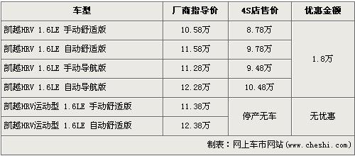據(jù)經(jīng)銷商處銷售人員介紹,凱越HRV共有6個(gè)車型,由于運(yùn)動(dòng)版車型現(xiàn)已停產(chǎn),經(jīng)銷店內(nèi)已經(jīng)沒有現(xiàn)車,所以在售的車型只有舒適版和導(dǎo)航版共4款車型。近期購(gòu)買凱越HRV的消費(fèi)者可以得到1.8萬(wàn)元的現(xiàn)金優(yōu)惠,經(jīng)優(yōu)惠后,入門級(jí)的1.6LE手動(dòng)舒適版車型售價(jià)從廠商指導(dǎo)價(jià)10.58萬(wàn)元跌至8.78萬(wàn)元。