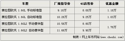 據(jù)經(jīng)銷商處銷售人員介紹,賽拉圖歐風(fēng)全系最高出現(xiàn)1.78萬元的優(yōu)惠。賽拉圖歐風(fēng)在售的有4個車型,入門級的1.6L手動標準版的優(yōu)惠金額為1.18萬元,售價從廠商指導(dǎo)價9.18萬元降到8萬元,1.6L豪華版的手動版和自動版車型都經(jīng)全系最高1.78萬元優(yōu)惠后,售價分別降至8.8萬元和9.9萬元。銷售人員還介紹,目前賽拉圖歐風(fēng)車型比較緊張,現(xiàn)車數(shù)量一般。