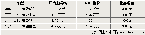據(jù)長安轎車4S店銷售人員介紹,奔奔目前現(xiàn)車都比較齊全,但與上月相比,優(yōu)惠幅度明顯有所減少。目前奔奔1.3L四款車型只能優(yōu)惠4000元,比上個(gè)月少1000元。但銷售人員也表示,如果消費(fèi)者到店詳談,還可能有進(jìn)一步優(yōu)惠的余地。