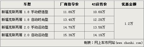 據(jù)長安福特經(jīng)銷商處銷售人員介紹,目前購買兩廂福克斯的消費者可以得到1.2萬元的優(yōu)惠。兩廂新款福克斯分為1.8L和2.0L兩種排量,入門級車型的1.8L手動舒適版經(jīng)優(yōu)惠后售價下降到了10.69萬元。而高配的2.0L自動運動版售價同樣也降到了14.19萬元。