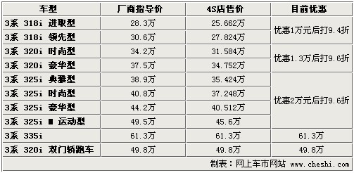 據(jù)4S店銷售人員介紹:目前寶馬3系全系車型都有一定幅度優(yōu)惠,最高降幅達到3.9萬元。雖然較之前的優(yōu)惠幅度有所減小,但是目前現(xiàn)車比較多,尤其寶馬318i系列與325i系列店內(nèi)現(xiàn)車充足,320i豪華型需預定,預訂需等1個月至2個月時間。據(jù)經(jīng)銷商介紹,寶馬318i進取型將近停產(chǎn),所以喜歡這款車的朋友盡快到店內(nèi)訂車,目前店內(nèi)有少量現(xiàn)車顏色不全。在優(yōu)惠幅度上,寶馬318i系列在優(yōu)惠1萬元后可打9.4折,寶馬320系列兩款車型在優(yōu)惠1.3萬元后可打9.6折,325系列可優(yōu)惠2萬后再打9.6折。寶馬335i和320i雙門轎跑車無任何優(yōu)惠,預定車需等4-6個月。