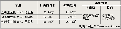 起亞進(jìn)口SUV全新索蘭托于7月29日正式上市銷售,前期推出了三款車,售價(jià)為22.98萬——26.78萬元。據(jù)網(wǎng)上車市價(jià)格監(jiān)測系統(tǒng)顯示:目前北京地區(qū)進(jìn)口起亞4S店內(nèi)無現(xiàn)車銷售,急于提現(xiàn)車的消費(fèi)者在店內(nèi)購買1.2萬元的裝飾后,即可在本周提到愛車,而預(yù)訂則需要等待一個(gè)月左右。
