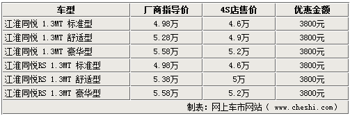 江淮的同悅及同悅RS系列車型,自上市后就吸引了眾多消費者關(guān)注。在三廂車型銷售很長時間之后,兩廂的RS版終于進入了北京市場開始銷售。網(wǎng)上車市網(wǎng)站由江淮轎車經(jīng)銷商處了解到,現(xiàn)在RS版以及三廂同悅車型店內(nèi)現(xiàn)車充足,購車最高可有3800元的現(xiàn)金優(yōu)惠。具體詳情如下: