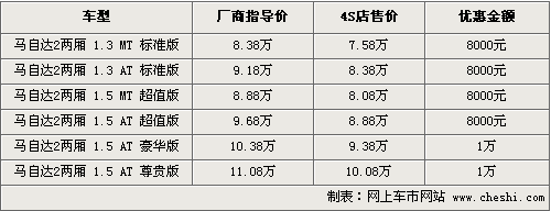 長安馬自達(dá)2系列車型在推出后備受關(guān)注,尤其兩廂車靈活多變的車身顏色和流線型的外觀非常惹人喜愛,三廂車總體的空間上也能滿足普通家庭出行的需要,是經(jīng)濟(jì)型轎車中的一款精品。目前筆者了解到,馬自達(dá)2系列最高優(yōu)惠幅度已經(jīng)過萬,具體車型以及價(jià)格如下列表:
