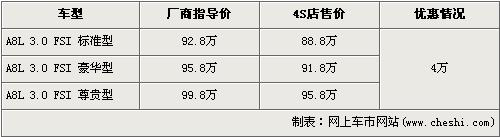 據(jù)北京奧迪經(jīng)銷店銷售人員介紹,目前奧迪A8L的3.0L車型有4萬元的優(yōu)惠。經(jīng)優(yōu)惠后,3.0L標(biāo)準(zhǔn)型的售價(jià)從92.8萬下降到了88.8萬元,3.0L豪華型的售價(jià)從95.8萬元下降到了91.8萬元,3.0L尊貴型的售價(jià)也從99.8萬元下降到了95.8萬元。銷售人員還介紹,店內(nèi)目前沒有現(xiàn)車,欲購(gòu)買的消費(fèi)者需交2萬元訂金,本月月底可提車。
