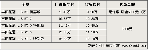 據(jù)4S店銷售人員介紹,花冠特惠版車型在配置方面比現(xiàn)在標(biāo)準(zhǔn)版有所減少,其中包括減少了遙控鑰匙、前進(jìn)氣格柵的鍍鉻裝飾條,揚(yáng)聲器由4個減少為2個,其他方面并沒有明顯變化,F(xiàn)在這款車定金為5000元-1萬元,最快月底到店,10月份將全面到店。同時現(xiàn)售的車型價格方面可以優(yōu)惠5000元現(xiàn)金,但現(xiàn)車數(shù)量不多,仍需要預(yù)訂。