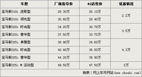 新寶馬3系在去年12月份正式在國內市場正式上市銷售,經過改款后的3系從外觀的流線,到內飾的風格均有一定程度的變化,帶給消費者的是全新的視覺沖擊和駕馭樂趣。根據網上車市價格監(jiān)測系統(tǒng)顯示,新寶馬3系車型全系出現了不同的現金優(yōu)惠,最高優(yōu)惠達到了4.3萬元,具體車型價格如下: