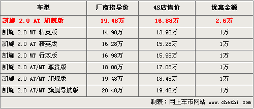 東風雪鐵龍凱旋在同級別車型中性價比較高,前沿的中控臺設(shè)計,中央集控式方向盤、EPS+GPS導(dǎo)航等豐富的配置均在凱旋上能夠看到。根據(jù)網(wǎng)上車市價格檢測系統(tǒng)顯示,目前個別商家針對凱旋推出了特價車型,優(yōu)惠幅度達2.6萬元,并可以獲得部分禮品,具體車型和價格如下: