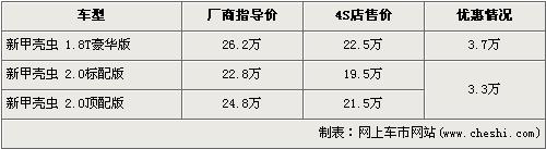 據(jù)4S店銷售人員介紹:目前甲殼蟲全系有最高3.7萬(wàn)元的優(yōu)惠。經(jīng)3.7萬(wàn)元優(yōu)惠后,1.8T豪華型售價(jià)從26.2萬(wàn)元下降到了22.5萬(wàn)元。2.0L的標(biāo)配版和頂配版經(jīng)3.3萬(wàn)元優(yōu)惠后,售價(jià)分別將為了19.5萬(wàn)元和21.5萬(wàn)元。