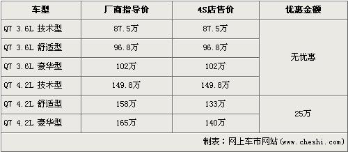 據(jù)經(jīng)銷(xiāo)商銷(xiāo)售人員介紹,在售的奧迪Q7已經(jīng)全部停產(chǎn),并且店內(nèi)3.6L車(chē)型已經(jīng)沒(méi)有現(xiàn)車(chē),并且也無(wú)法預(yù)訂。4.2L車(chē)型除了舒適版和豪華版外也均無(wú)現(xiàn)車(chē)。經(jīng)25萬(wàn)元優(yōu)惠后,奧迪Q7 4.2L舒適版售價(jià)從158萬(wàn)元下降到了133萬(wàn)元,4.2L豪華版售價(jià)也從165萬(wàn)元下降到了140萬(wàn)元。如果有想入手Q7的消費(fèi)者,現(xiàn)在是一個(gè)不錯(cuò)的好時(shí)機(jī)。
