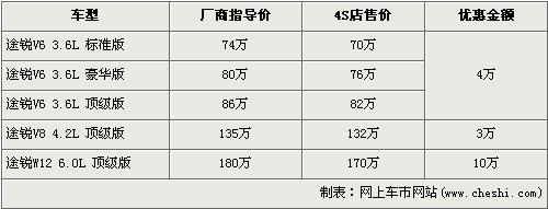 途銳是大眾首款引進我國的SUV車型,在3.6L及4.2L率先上市后,大眾為了滿足消費者的更大胃口,緊接著又推出了搭載12缸發(fā)動機的6.0L車型。隨著大排量消費稅的頒布,給9月份后入關(guān)的大排量車型帶來了一次不小的沖擊,令大排量汽車價格都上調(diào)了不少,大眾途銳6.0L頂級版也從原來158萬元的價格上調(diào)至了180元。近日據(jù)網(wǎng)上車市價格系統(tǒng)監(jiān)測顯示,大眾途銳全系的最高優(yōu)惠達到了10萬元,具體詳情請看下表: