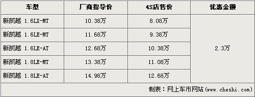 據(jù)4S店銷售人員介紹,新凱越分為1.6L與1.8L兩種排量車型,目前新凱越全系優(yōu)惠2.3萬(wàn)元,較上個(gè)月的優(yōu)惠降幅有所上升。經(jīng)優(yōu)惠后,全系最低配的1.6LX-MT車型售價(jià)下降到了8.08萬(wàn)元。經(jīng)優(yōu)惠后,1.8L手動(dòng)和自動(dòng)兩款車型售價(jià)也下降到了11.08萬(wàn)元和12.68萬(wàn)元。銷售人員還介紹,目前店內(nèi)現(xiàn)車齊全,是消費(fèi)者挑選的較好時(shí)機(jī)。