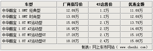酷寶系列車型,不僅外形時(shí)尚,動力也相當(dāng)充沛,不僅可與進(jìn)口跑車如蓮花競速相媲美,也帶動了自主跑車市場的競爭。近期網(wǎng)上車市網(wǎng)站了解到,隨著市場競爭的加劇,現(xiàn)在北京的中華4S店內(nèi)最高可給出24000元的現(xiàn)金優(yōu)惠,令此車型再次引起關(guān)注。具體詳情如下: