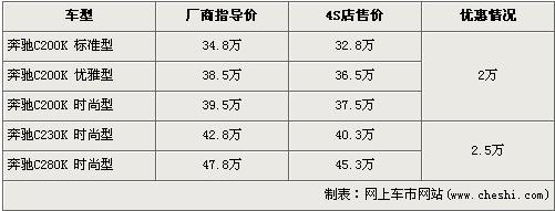 奔馳C級轎車一直就是奔馳里最暢銷的車型,它的總銷量占到了奔馳總銷量的三分之一。目前,國內(nèi)銷售的奔馳C級轎車是去年新上市的全新C級車型,全系分為C200K、C230和C280三種類別共5款車型,售價區(qū)間為34.8萬元-47.8萬元。近日據(jù)北京奔馳經(jīng)銷店銷售人員介紹,目前奔馳C級全系最高優(yōu)惠2.5萬元,具體詳情請看下表: