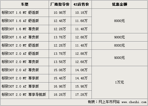 東風(fēng)標(biāo)致旗下的“大嘴”307,自在08年上市至今得到了消費(fèi)者的一直認(rèn)可和喜愛(ài)。根據(jù)網(wǎng)上車(chē)市價(jià)格監(jiān)測(cè)系統(tǒng)顯示,東風(fēng)標(biāo)致將于9月17日正式推出新款標(biāo)致307,同時(shí)老款優(yōu)惠幅度進(jìn)一步加大。具體車(chē)型以及價(jià)格如下: