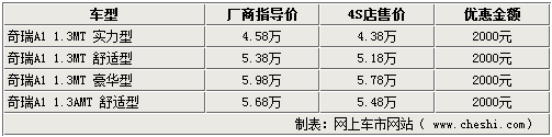 09款奇瑞A1系列在老款車型的基礎(chǔ)上增加了實(shí)力型和AMT兩種新車型,同時(shí)舒適型和豪華型官方降價(jià)4000元,售價(jià)已進(jìn)入五萬(wàn)元以內(nèi)。網(wǎng)上車市網(wǎng)站近日了解到,各家4S店內(nèi)的新車價(jià)格有所變化,全系車型均可小幅優(yōu)惠2000元。詳情如下: