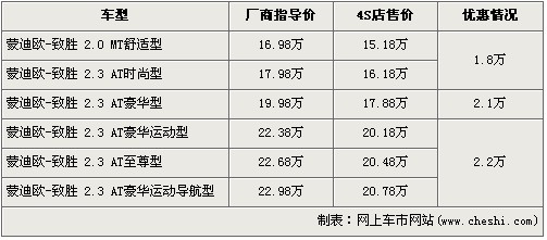 據(jù)4S店銷(xiāo)售人員介紹:在售的蒙迪歐-致勝共有6款車(chē)型,近期購(gòu)買(mǎi)的消費(fèi)者最高可以得到2.2萬(wàn)元的優(yōu)惠。入門(mén)級(jí)的2.0L手動(dòng)舒適版以及2.3L自動(dòng)時(shí)尚版經(jīng)1.8萬(wàn)元的優(yōu)惠后,售價(jià)分別降為了15.18萬(wàn)元和16.18萬(wàn)元,2.3L自動(dòng)豪華版經(jīng)2.1萬(wàn)元優(yōu)惠后,售價(jià)降到了2.1萬(wàn)元。2.3L豪華運(yùn)動(dòng)版、至尊版以及豪華運(yùn)動(dòng)導(dǎo)航版經(jīng)全系最高的2.2萬(wàn)元優(yōu)惠后,售價(jià)分別降為了20.18萬(wàn)、20.48萬(wàn)以及20.78萬(wàn)元。