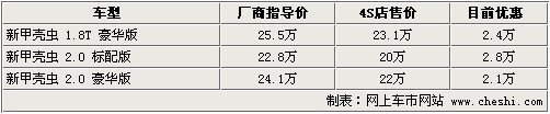 據(jù)4S店銷售人員介紹:目前甲殼蟲硬頂版本車型共有3款,1.8T車型車源較為緊張。2.0升兩款車型目前顏色較為齊全,有綠色、紅色、米色車款,可優(yōu)惠2.1萬-2.8萬。1.8T車型只有天空藍顏色,且現(xiàn)車非常少,優(yōu)惠幅度為2.4萬元。如需預(yù)定其他顏色車型,需等待1-2周時間。