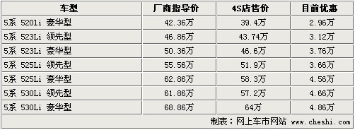 據(jù)4S店銷售人員介紹:目前寶馬5系最高優(yōu)惠4.86萬元,部分車型有現(xiàn)車。520Li領(lǐng)先型由于銷量不好,所以暫時停產(chǎn),目前2.0排量車型只有520Li豪華型。523Li系列車型只有523Li豪華型有現(xiàn)車,但顏色不全只有銀色黑內(nèi)飾車款,如預定523Li領(lǐng)先型需等1-2個月時間。525Li系列豪華型有現(xiàn)車,顏色為銀色、白色及灰色,525Li領(lǐng)先型車款預訂需等1個月時間。530Li領(lǐng)先型有金色、銀色現(xiàn)車,530Li豪華型有灰色現(xiàn)車。目前最高優(yōu)惠可達4.86萬元,優(yōu)惠幅度較大。