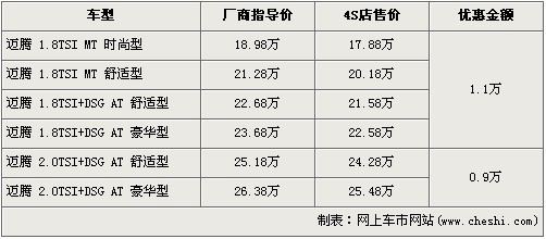 邁騰是一汽大眾主打中級車市場的車型,自上市以來一直受到了好評。今年3月份搭載DSG雙離合變速器的全新邁騰上市,缸內(nèi)直噴發(fā)動機(jī)匹配DSG雙離合變速器的完美結(jié)合另邁騰再一次的成為了焦點(diǎn)。近日據(jù)網(wǎng)上車市價格系統(tǒng)監(jiān)測顯示,邁騰全系最高優(yōu)惠1.1萬元,具體價格詳情請看下表: