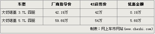 吉普大切諾基是吉普家族中極具個(gè)性的一款大尺寸車(chē)型,在推出3.7L排量車(chē)型后,消費(fèi)者的選擇空間更大,同時(shí)帶給駕乘者完全不同的駕駛體驗(yàn)。根據(jù)網(wǎng)上車(chē)市價(jià)格監(jiān)測(cè)系統(tǒng)顯示,目前大切諾基最高優(yōu)惠5.69萬(wàn)元,具體車(chē)型以及價(jià)格如下: