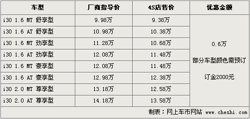 據(jù)北京現(xiàn)代4S店銷(xiāo)售人員介紹,目前現(xiàn)代i30現(xiàn)金優(yōu)惠6000元,店內(nèi)有少量1.6舒享型及1.6豪享型現(xiàn)車(chē),顏色以紅色、黑色、銀色為主。其余車(chē)型預(yù)訂最快1周可提車(chē),訂金為2000元。關(guān)注此車(chē)的朋友可致電4S店詳詢(xún),北京地區(qū)各4S店由于訂單不同,各店銷(xiāo)售的現(xiàn)車(chē)顏色有所不同。