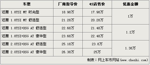 邁騰是一汽大眾主打中級車市場的車型,自上市以來一直受到了好評。今年3月份搭載DSG雙離合變速器的全新邁騰上市,缸內直噴發(fā)動機匹配DSG雙離合變速器的完美結合另邁騰再一次的成為了焦點。近日據網上車市價格系統(tǒng)監(jiān)測顯示,邁騰全系最高優(yōu)惠1.38萬元,具體價格詳情請看下表: