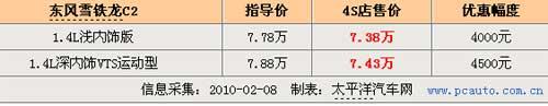 筆者近日走訪北京東風雪鐵龍4S店時獲悉,目前店內(nèi)一批1.4L C2增配車型正進行促銷,除了增加(駕駛座椅高度可調(diào)、電動后視鏡、電動后窗)等配置外,現(xiàn)金優(yōu)惠方面也最高達到了4500元,算下來累積優(yōu)惠達到萬元左右。據(jù)了解4S銷售人員表示他們更看好1.4升車型在北京市場的銷售,原因主要是C2作為一款以運動、時尚和外觀為特點的小車型,吸引的更多是年輕人的目光,而這批獨有顏色的車型也是為了迎合了此類需求。