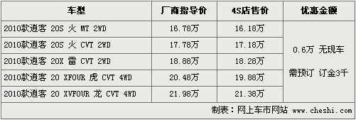 據(jù)東風(fēng)日產(chǎn)4S店銷售人員介紹,目前2010款逍客現(xiàn)車供應(yīng)仍然很緊張,但近期購(gòu)買可優(yōu)惠現(xiàn)金6000元,預(yù)訂訂金為3000元,大概1個(gè)月左右時(shí)間可以提到現(xiàn)車。另?yè)?jù)介紹,逍客在未來(lái)幾個(gè)月時(shí)間里將推出新款車型,在外觀方面的變化較大,新款車型線條更加流暢。