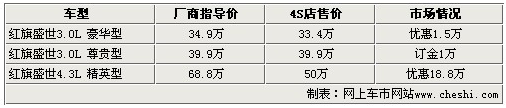 據(jù)紅旗盛世4S店銷售人員介紹,很多紅旗汽車的愛好者一直很關(guān)注盛世的情況,到店看車的消費者也多。目前紅旗盛世車型3.0L豪華型有少量現(xiàn)車,4.3L精英型僅有兩臺現(xiàn)車,3.0L尊貴型暫時沒有現(xiàn)車。如有意購買3.0L尊貴型可以預(yù)訂,訂金為1萬元,但是新車到店的時間不能確定。其他兩款有現(xiàn)車的車型均有不同幅度的優(yōu)惠,購買3.0L豪華型可享1.5萬的現(xiàn)金優(yōu)惠,4.3L精英型的降價幅度較大,達到了18.8萬,最終售價僅為50萬元。
