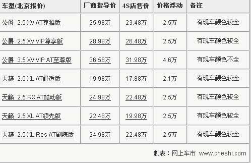 中級(jí)豪華車的標(biāo)桿-------新天籟全系采用了CVT無(wú)級(jí)變速箱,連續(xù)的動(dòng)力輸出雖然少了駕駛激情,但順暢的動(dòng)力輸出帶來了平順的駕乘感受,日產(chǎn)系列發(fā)動(dòng)機(jī)不錯(cuò)的抑噪能力也是很有群眾口碑的,配合新天籟寬大舒適的座椅,無(wú)論是駕駛還是乘坐,都是一種愜意的享受,商用和家用兩者皆可。近日根據(jù)網(wǎng)上車市價(jià)格監(jiān)測(cè)系統(tǒng)顯示,目前購(gòu)買天籟最高可以享受到4.7萬(wàn)元的價(jià)格優(yōu)惠,最低售價(jià)僅為17.88萬(wàn),具體車型售價(jià)見下表: