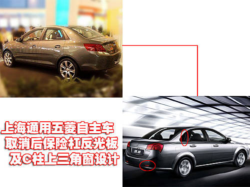 上海通用五菱自主轎車采用一體式設計,替代了上海通用別克凱越的分體社尾燈,顯得更加飽滿。此外,別克凱越后保險杠上的反光板和C柱上的三角窗設計,均沒有出現(xiàn)在上海通用五菱自主轎車。