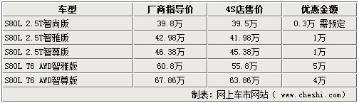據(jù)4S店銷售人員介紹,全新的2010款S80L將于本月下旬到店開始銷售,除最高配的T6智尊版外,全系車型在配置上新增了GPS導(dǎo)航以及可視倒車影像等系統(tǒng),在外觀內(nèi)飾方面則換裝金屬裝飾條以及車內(nèi)裝飾等,價格上除T6智尊版外各款車型均比老款要增加了3千至4千元左右。目前國產(chǎn)09款沃爾沃S80L有部分現(xiàn)車,有銀色、金色車身外觀可供消費(fèi)者挑選,全系車型除最低配的車型外均有現(xiàn)車供應(yīng),最高優(yōu)惠達(dá)5萬元。