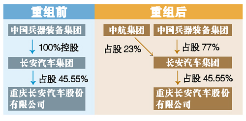 與此前“中航將汽車資產(chǎn)無償劃撥給長安汽車集團(tuán)”的報道不同, 根據(jù)重組方案,中航工業(yè)以其持有的昌河汽車、哈飛汽車、東安動力、昌河鈴木、東安三菱的股權(quán),劃撥給兵裝集團(tuán)旗下的中國長安汽車集團(tuán);兵裝集團(tuán)將旗下中國長安汽車集團(tuán)23%的股權(quán)劃撥給中航工業(yè)。兩集團(tuán)重組成立新的中國長安汽車集團(tuán)股份有限公司,兵裝集團(tuán)持股77%、中航工業(yè)持股23%。