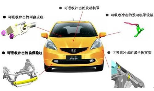 當(dāng)行人與車輛發(fā)生交通事故時(shí),最主要的死亡原因是來自于行人頭部的傷害,而最主要的重傷部位是腿部。如下圖所示,為了保護(hù)行人頭部,飛度的發(fā)動(dòng)機(jī)罩、翼子板支架等部位采用了碰撞吸能結(jié)構(gòu);為了保護(hù)腿部,保險(xiǎn)杠的前部也采用了碰撞吸能材料。