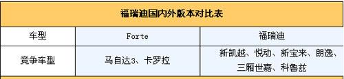 由于二者的定位不同,國內(nèi)外的競爭車型也有很大差別,在國外Forte最直接的競爭被鎖定為馬自達3和豐田的卡羅拉,但再國內(nèi),這一情況將有所改變。目前來看,福瑞迪將來最有力的競爭者將是新凱越、悅動、新寶來、朗逸、三廂世嘉、科魯茲等車型。和卡羅拉、馬自達3的的競爭關(guān)系并不是很明顯。