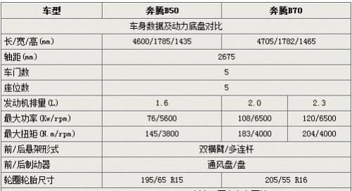 奔騰B50車長4600mm,比同平臺的B70要小近100mm,軸距同為2675mm。而B50的1.6L引擎動(dòng)力表現(xiàn)要略遜于B70所搭載的2.0與2.3L引擎,但也足夠滿足城市代步的需要。15存的輪胎尺寸也要略小于B70。