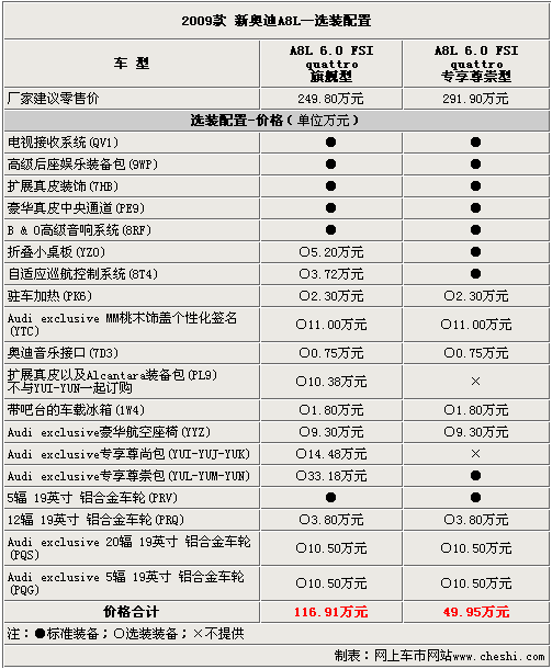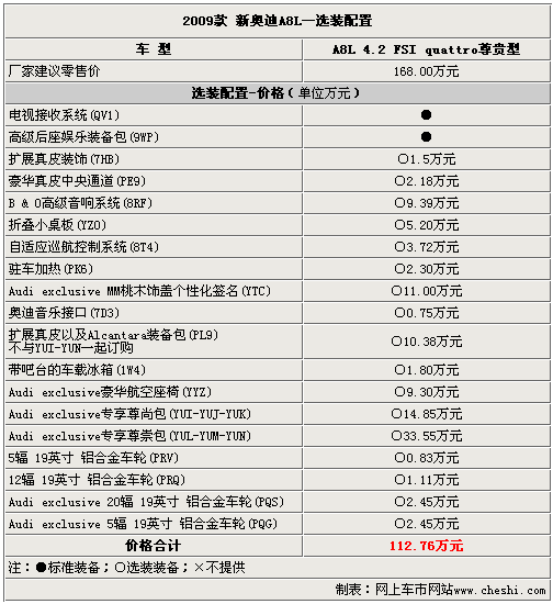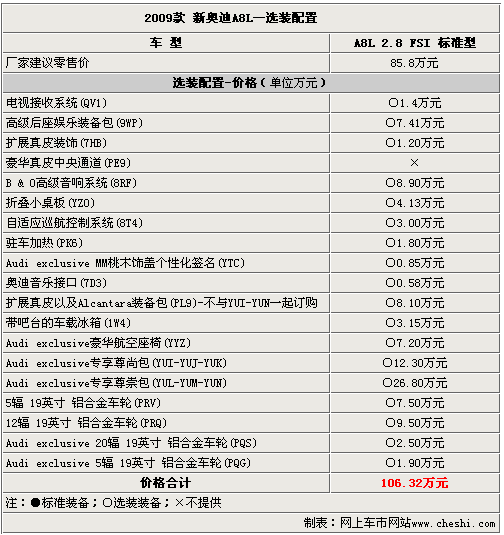 以上的選裝配置需要在預(yù)訂車輛前選擇好,經(jīng)銷商會根據(jù)客戶的訂單向廠家發(fā)送配置代碼。09款奧迪A8L的選裝配置十分豐富,完全可以滿足對配置有需求消費(fèi)者的“苛刻”要求。當(dāng)然,這些配置也需要不菲的金錢才可以擁有,究竟哪些配置適合有品位懂得享受的您呢?