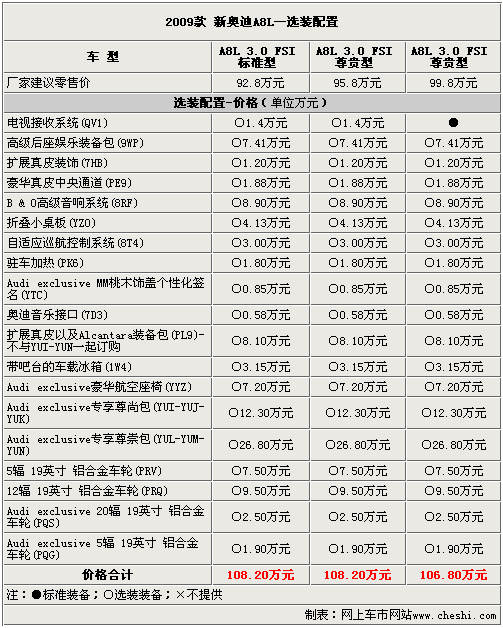 新上市的奧迪A8L 3.0FSI主打性價(jià)比,在標(biāo)準(zhǔn)配置上要高于奧迪A8L 2.8FSI。在選裝配置上,價(jià)格略低的基本型以及豪華型可以選裝所提供的全部的配置,總價(jià)均超過了百萬元。而售價(jià)接近百萬元的尊貴型除了價(jià)值1.4萬元的“電視接收系統(tǒng)”為標(biāo)準(zhǔn)配置外不必選裝,其余配置均需要選裝。