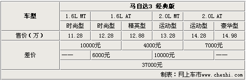 長安馬自達馬3經(jīng)典版1.6L排量車型共有3款車型,由于外觀、內(nèi)飾和舒適豪華配置的差異,這3款車的最高差價為6000元。而長安馬自達馬3經(jīng)典版1.6L手動時尚型和2.0L自動豪華型除配置差異外,動力性能也存在一定的差距,所以差價高達3.7萬元。